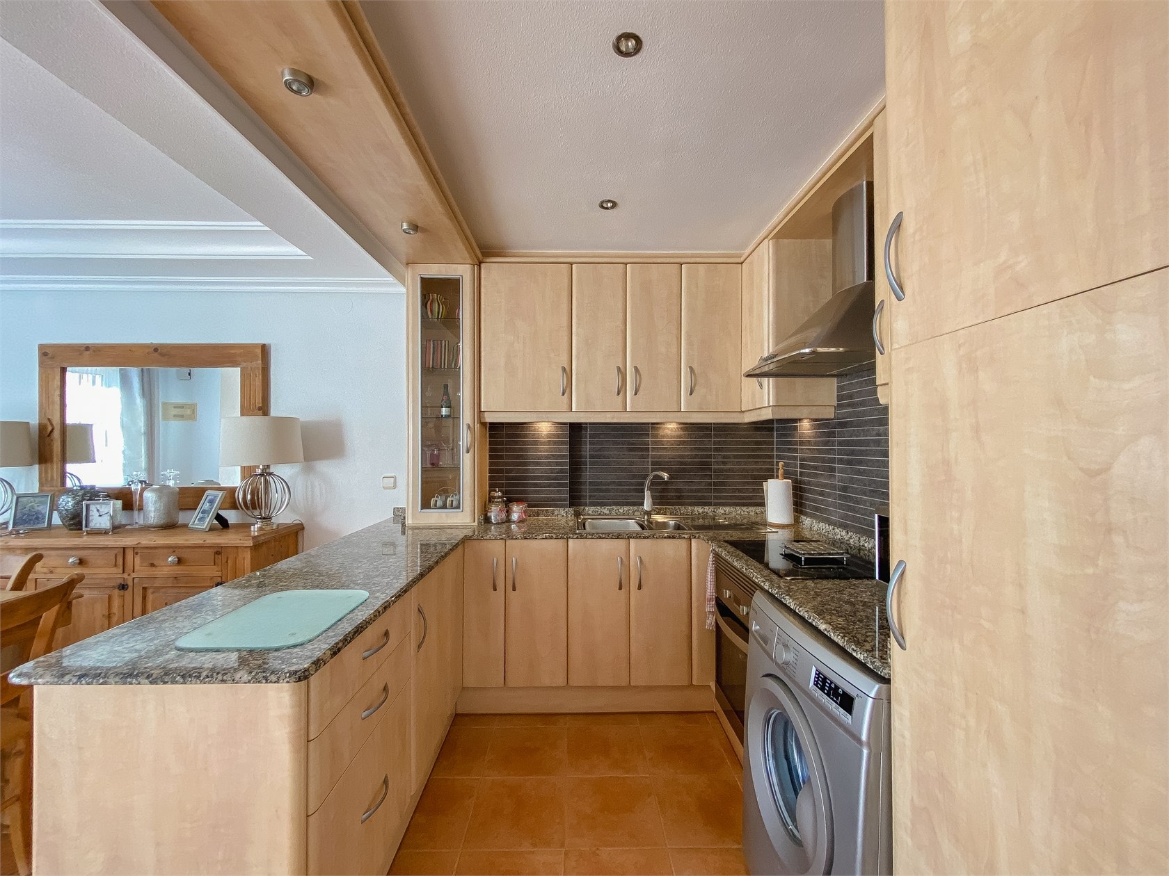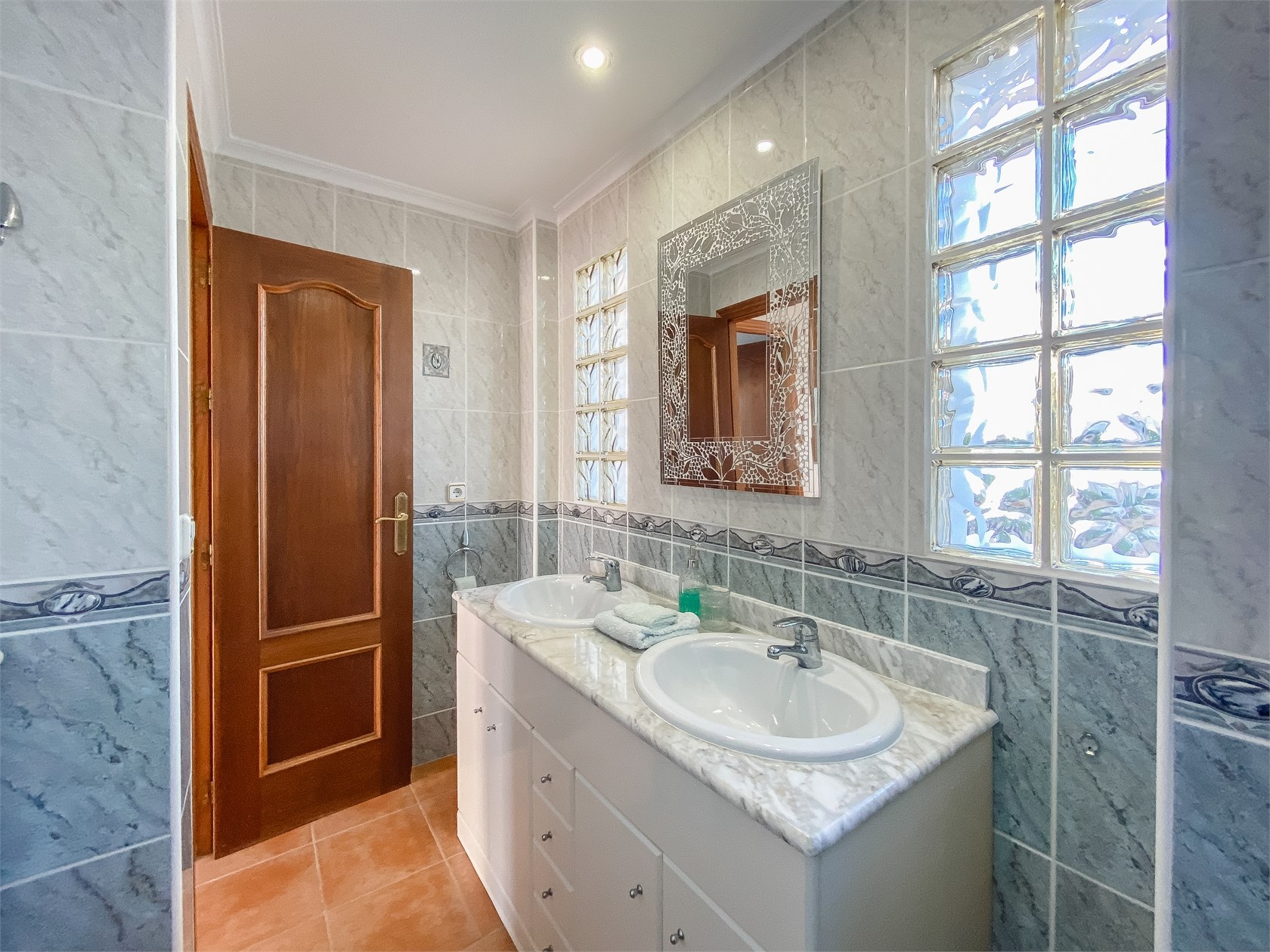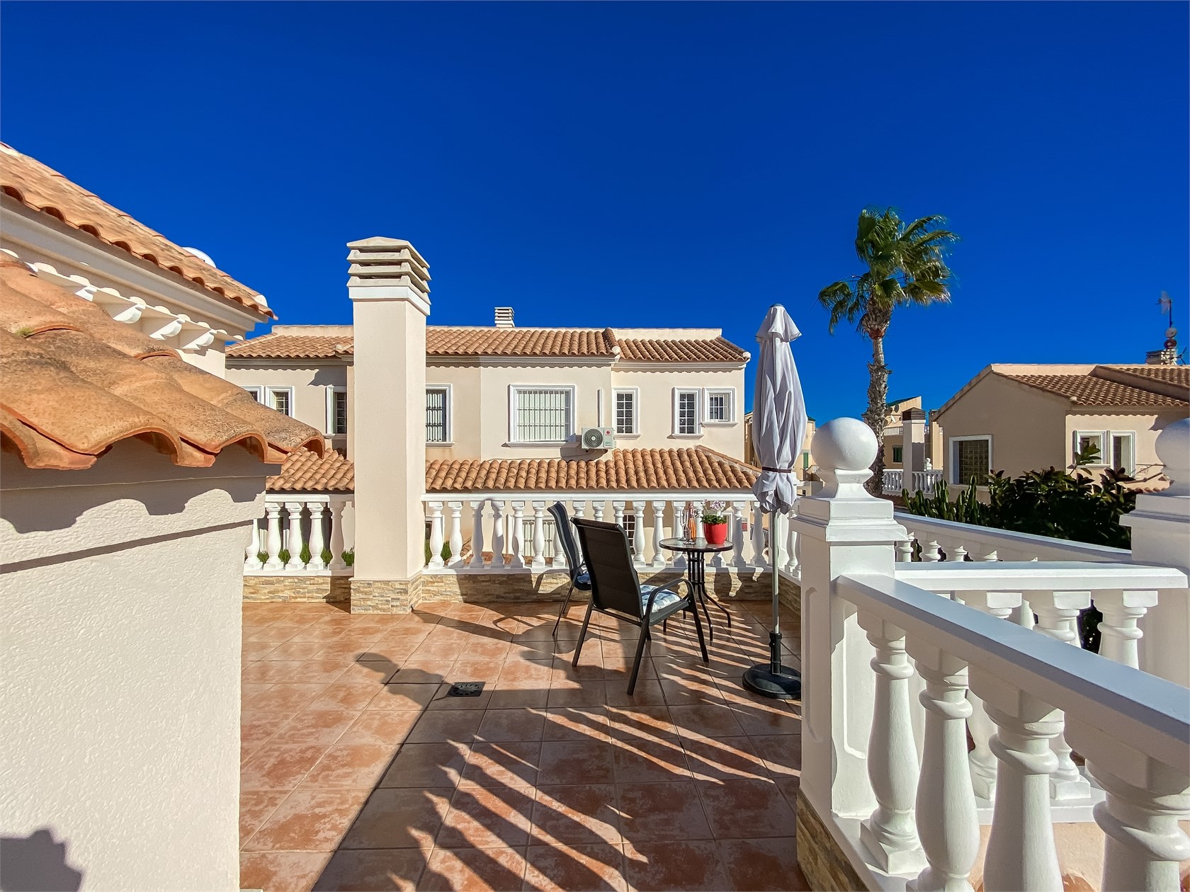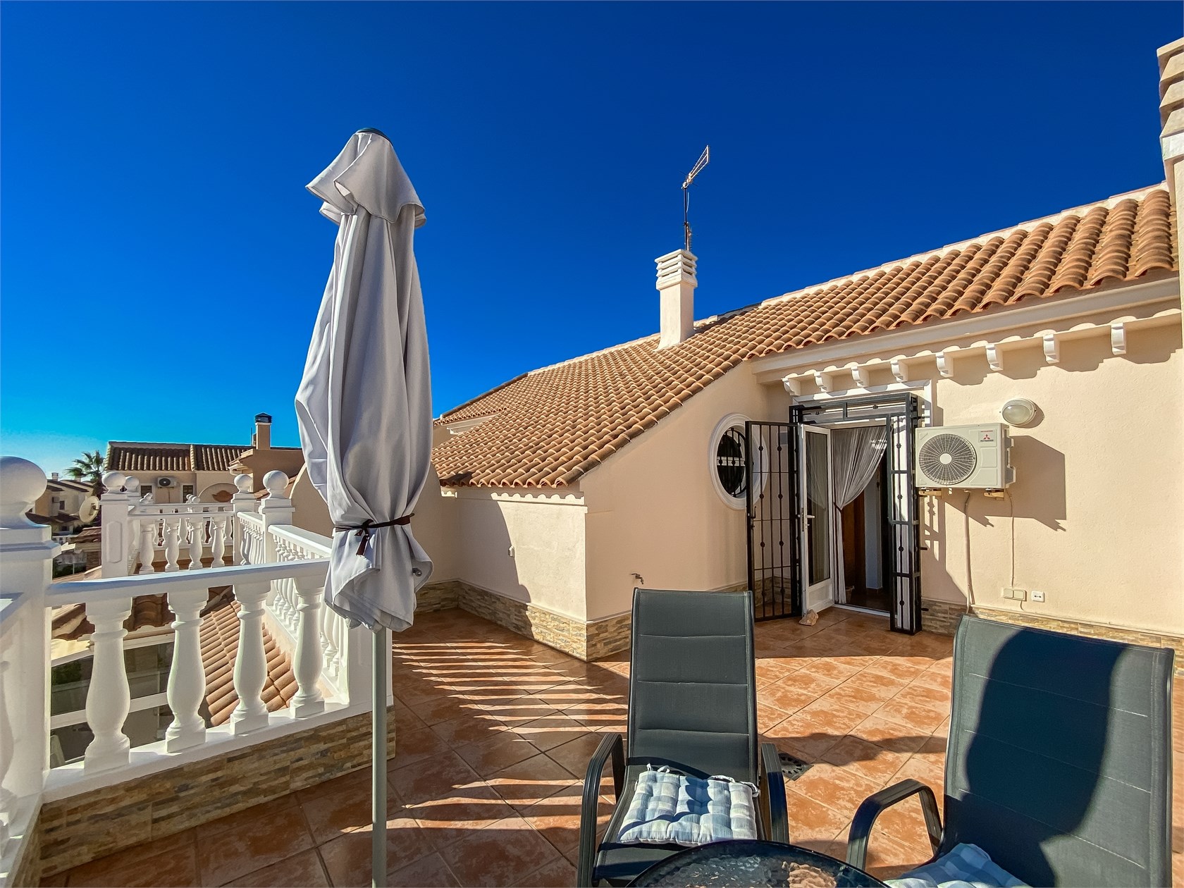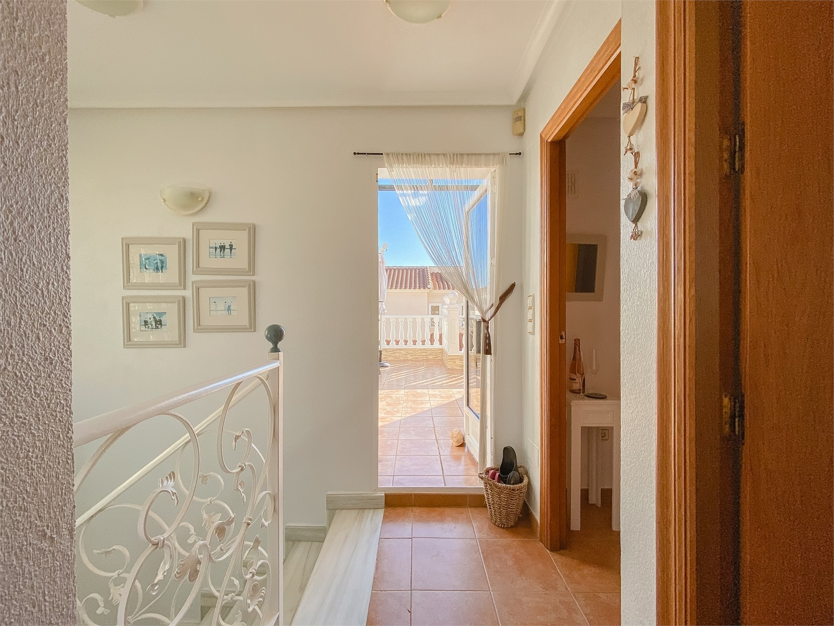 Dominantou domu jsou tři terasy orientované od východu na západ, což zajišťuje přirozené světlo a slunce během celého dne. Ranní káva na východní terase, odpolední relax na západní – přesně ten typ bydlení, kvůli kterému lidé kupují nemovitost u moře.